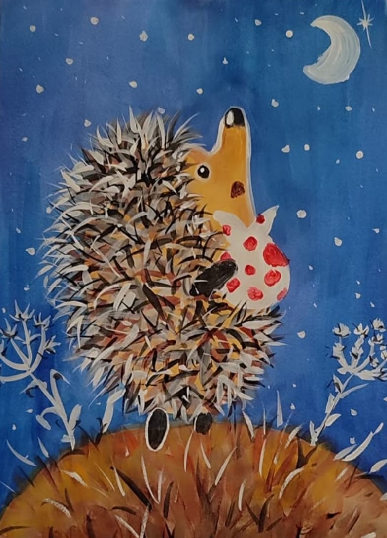 Нанести краску с учётом композиции, экспериментируя с насыщенностью, создать переходы. Использовать различные инструменты: кисти, губки, ластики.