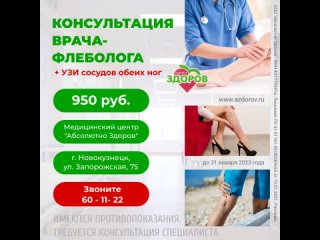 АКЦИЯ продолжается до 31 января. Приём врача-флеболога и УЗИ сосудов обеих ног 950 рублей. Если вы ощущаете тяжесть в голенях, появилась отёчность ног, ноги быстро утомляются, немеют или есть судороги, а также на коже появились «звездочки», увеличились вены, изменился цвет кожи, рекомендуем посетить, не откладывая, врача-флеболога.