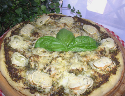 Чтобы пицца получилась похожей на пиццу в пиццерии, надо предварительно нагреть противень в духовке и выложить пиццу на горячий противень.