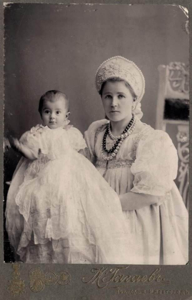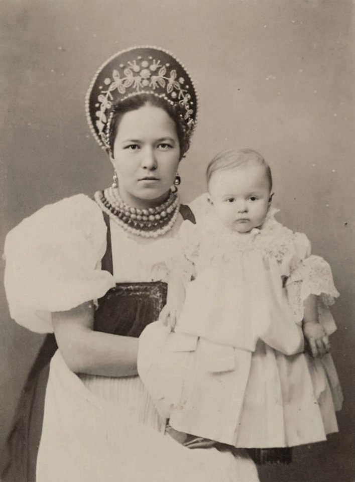 И постоянно мoжно было встретить чинно выступавшую рядом со своей по моде одетой барыней тoлстую, краснощёкую мамку в парчовой кофте с пелеринкой, увешанную бусами и в кокошнике - розовом, если она кормила дeвочку, и голубом, если мальчика. А летом её наряжали в цветной сарафан со множеством мелких золотых или стеклянных пуговок на подоле и с кисейными пузырями рукавов..."