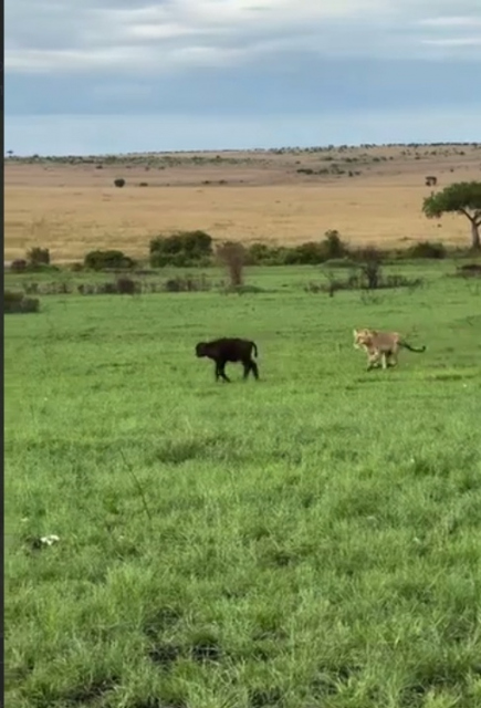 Мама буйвол защищает своего детеныша.