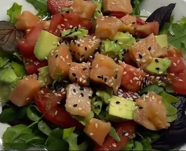 Зелень промыть. Помидор и красную рыбу нарезаем кубиками. Авокадо в кожуре нарезаем кубиками и достаём ложкой. Выкладываем зелень, помидор, рыбу и авокадо. Заправляем кунжутным маслом, солью. И украшаем кунжутом по желанию.