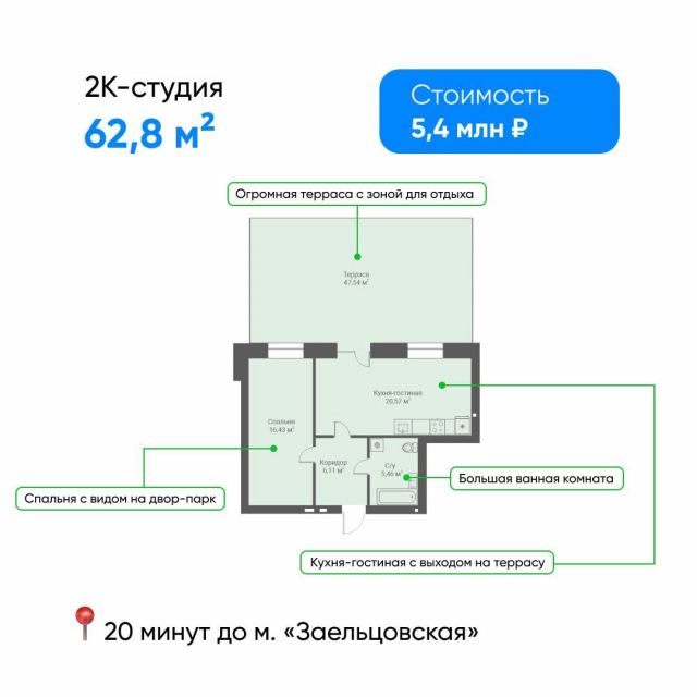 Последняя 2-комнатная студия с личным пространством на свежем воздухе в экоквартале «Малахит»!