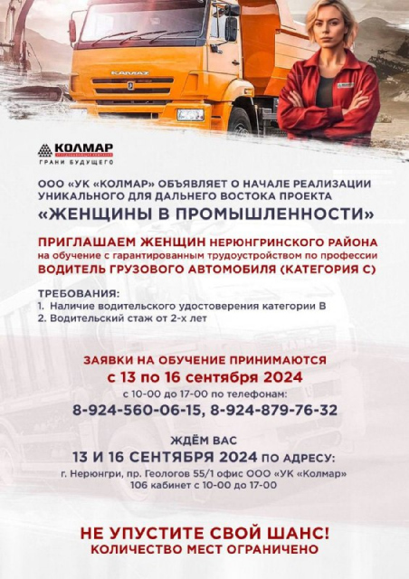 Угледобывающая компания «Колмар» 12 сентября 2024, 15:07 Вниманию прекрасной половины Нерюнгринского района ! Источник: t.me