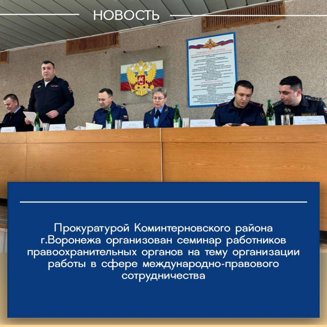 В Коминтерновском районе Воронежа проведен совместный семинар работников правоохранительных органов на тему международно-правового сотрудничества, порядке работы по вопросам выдачи лиц для уголовного преследования или исполнения приговора, а также оказания правовой помощи по уголовным делам.