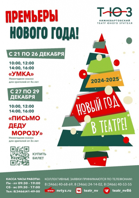 НОВЫЙ ГОД В ТЮЗЕ 🎄❗Мы запускаем продажи новогодних спектаклей ❗ В это году вас ждут только ПРЕМЬЕРЫ 💯 Для малышей от 2-х лет Добрая история про Снеговика-почтовика "Письмо Деду Морозу" (0+)🎅 Для юных зрителей от 4-х летТрогательная северная сказка о дружбе и семье - "Умка" (0+)🐻❄ А на площадках школ города представим интерактивное новогоднее приключение "Белая сказка" (6+) с весёлыми танцами и активными играми ❄ После каждого спектакля зрителей ждёт встреча с Дедом Морозом и Снегурочкой 🥰Ребята поиграют с ёлочкой и смогут сделать красивые фото❗ Билеты уже на нашем сайте: https://nvtyz.ru/afisha Афиша nvtyz.ru