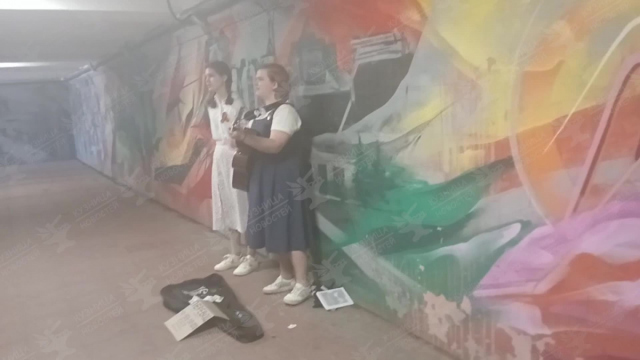 В переходе у городской администрации две девушки поздравляют новокузнечан исполнением военных песен.