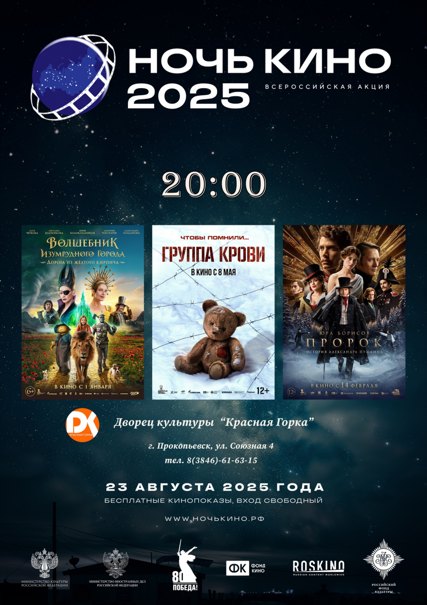 Приготовьтесь к незабываемому киноприключению! 23 августа в 20:00 мы приглашаем вас на грандиозную Всероссийскую акцию «Ночь кино» под открытым небом в сквере Дворца Культуры «Красная Горка»!