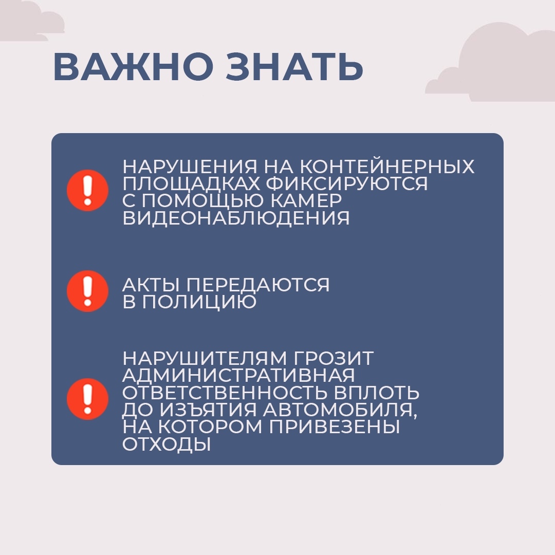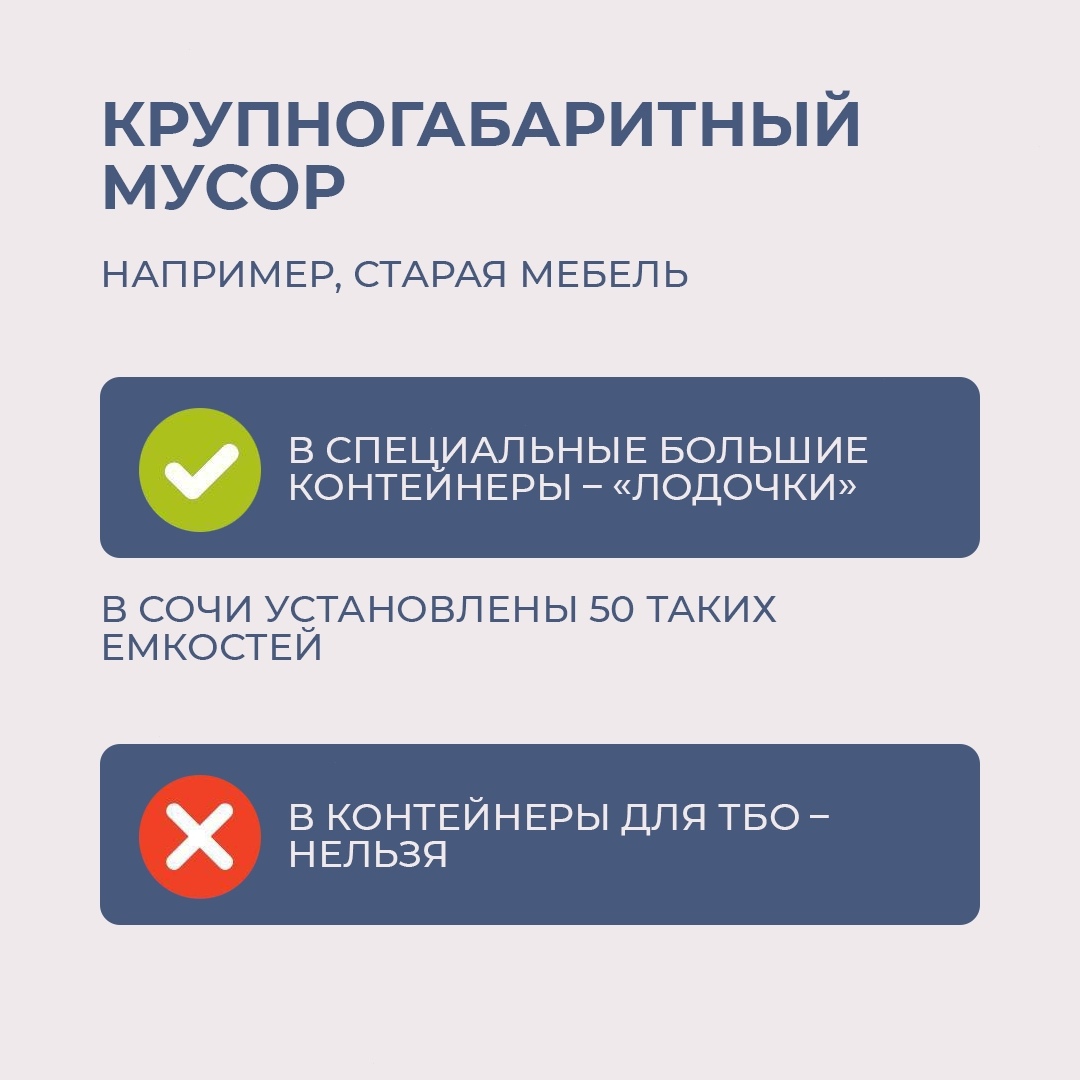 Напоминаем, что для крупногабаритного мусора предусмотрены отдельные контейнеры. Перечень мест, где установлены контейнеры для крупногабаритного мусора, размещен по ссылке. (https://clck.ru/3Q9jJd)